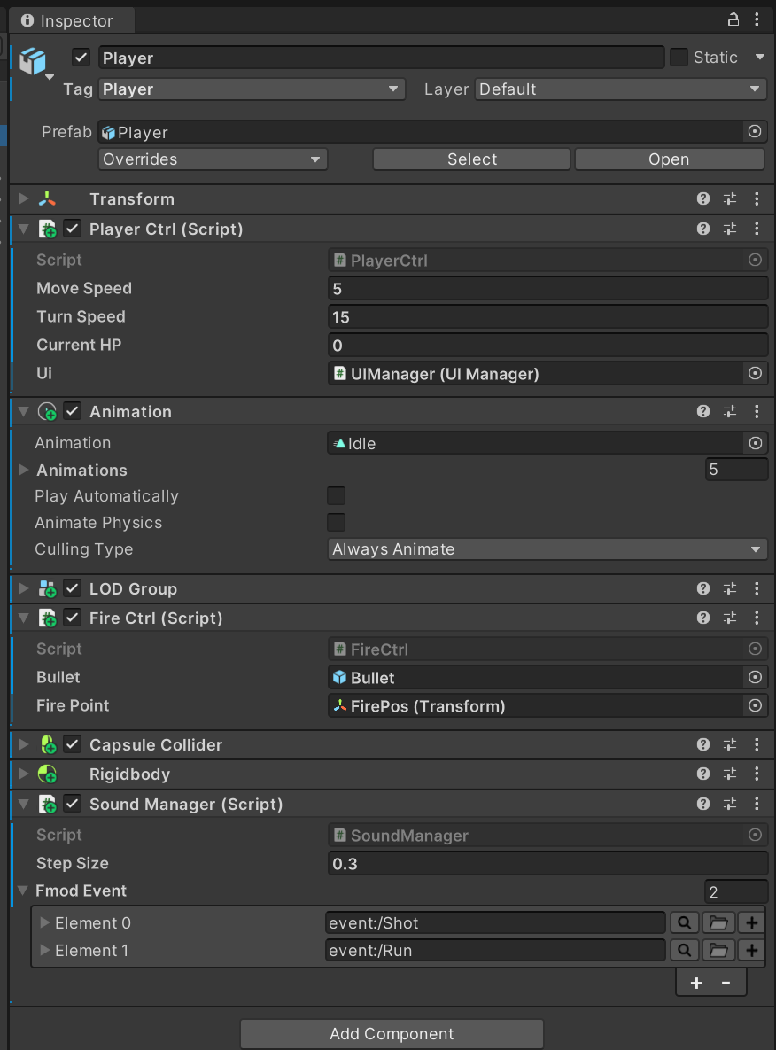 플레이어를 컨트롤하는 스크립트이다. 여기에서 Audio관련 컴포넌트는 찾아볼 수 없다.